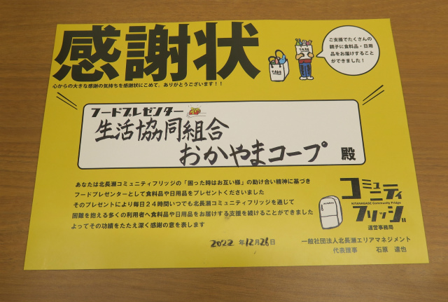 (一社)北長瀬エリアマネジメント代表理事の石原達也さんからは、「日本のお正月に欠かせないお餅をご寄付くださりありがとうございます。助け合いの気持ちで、これからも一緒に子ども達を支えていきたいです」というお礼の言葉と、感謝状を頂戴しました。