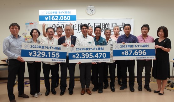 恩納村ふれあい体験学習センター(沖縄県恩納村)で開催された「もずく基金」贈呈式では、コープCSネットの2022年度「もずく基金」2,395,470円の目録が手渡されました。この基金により、サンゴ950本が移植される予定です。