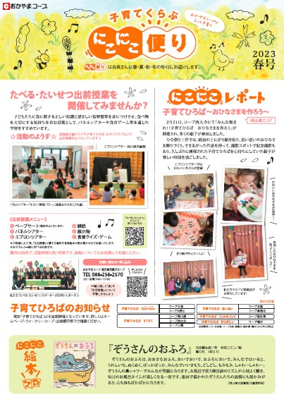 HOME 最新情報・お知らせ 「にこにこ便り」2023春号を発行しました 最新情報・お知らせ 「にこにこ便り」2023春号を発行しました 2023/04/18 子育てくらぶ「にこにこ便り」2023春号を発行しました。 今回の「にこにこレポート」は、「みんな集まれ!!子育てひろば おひなさまを作ろう」(岡山東エリア 子育てひろば)と「たべる・たいせつ出前授業を開催しませんか?」を紹介しています。 コープのお店のラック等にも置いてありますので、ぜひご覧ください。 ↓こちらをクリック↓ ⇒バックナンバーはこちらから お知らせ一覧に戻る