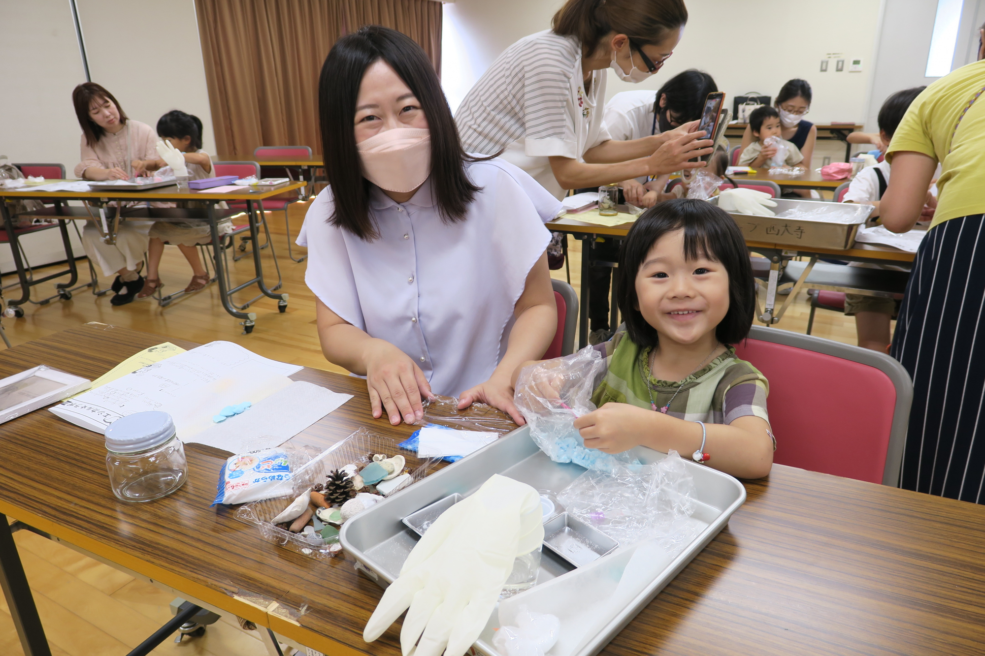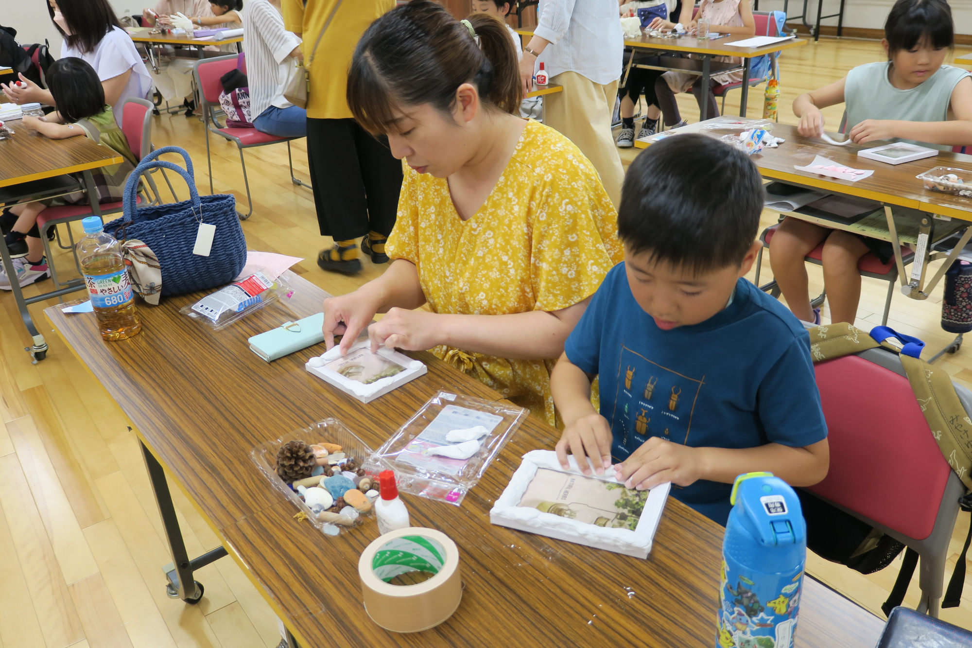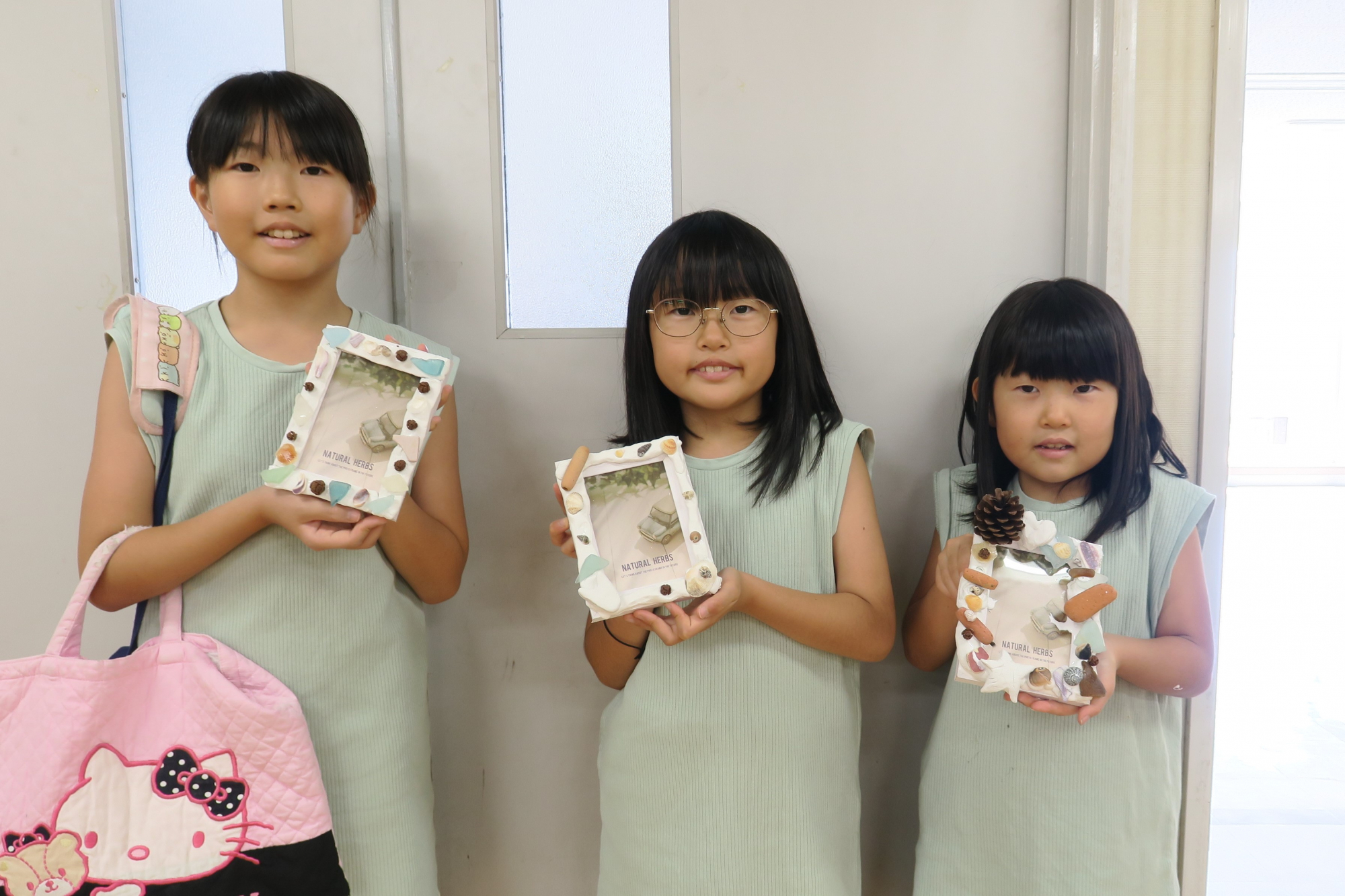 その後、5月に開催された「きれいな砂浜を取り戻そう!~みんなで海ごみ回収しませんか~」で拾った廃材を使って、フォトフレーム作りをしました。子ども達は、紙粘土に貝殻や松ぼっくり、プラスチックゴミなどを貼り付け、思い思いの作品を作りました。