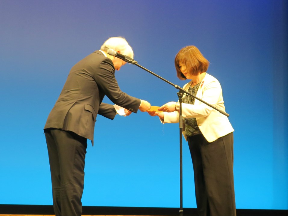 日本ユニセフ協会 小倉真吾さんから感謝状を受け取る萩原美江(よしえ)全体理事(右)