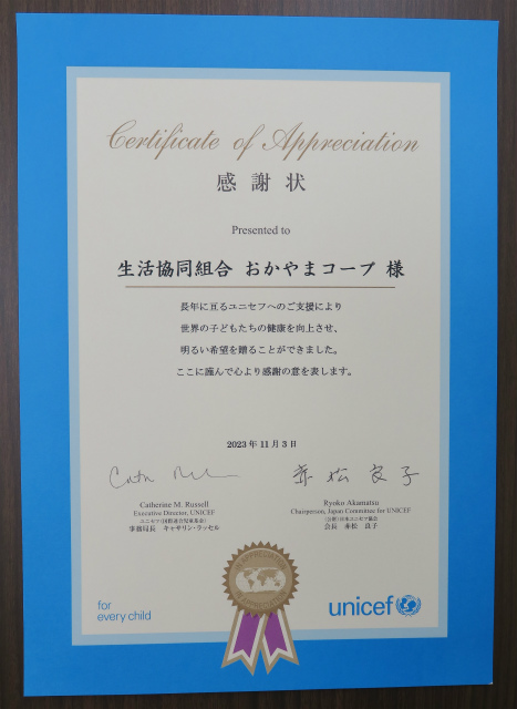おかやまコープは、世界の子どもたちを支援する国際協力として、1984年から「ユニセフ募金」や「ユニセフ ハンド・イン・ハンド(街頭募金)」などで協力しています。