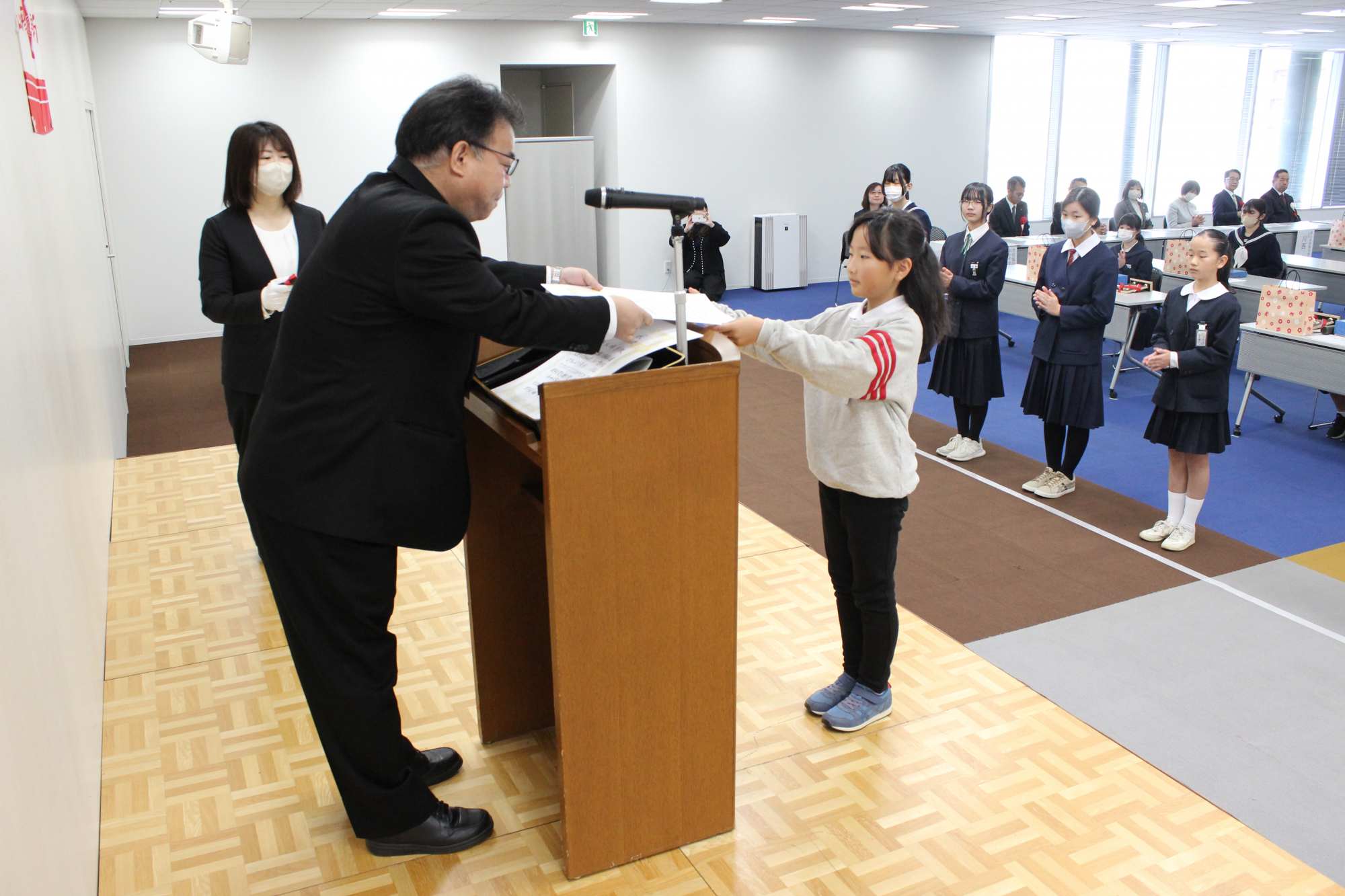 表彰状を児童に手渡す志賀組織本部長(左)