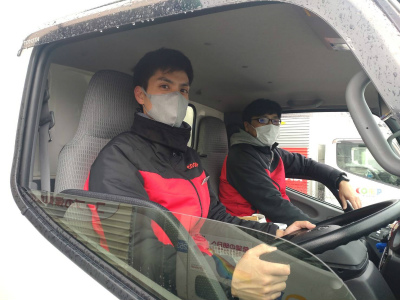 コープいしかわのトラックで配送支援を行うおかやまコープ職員2名