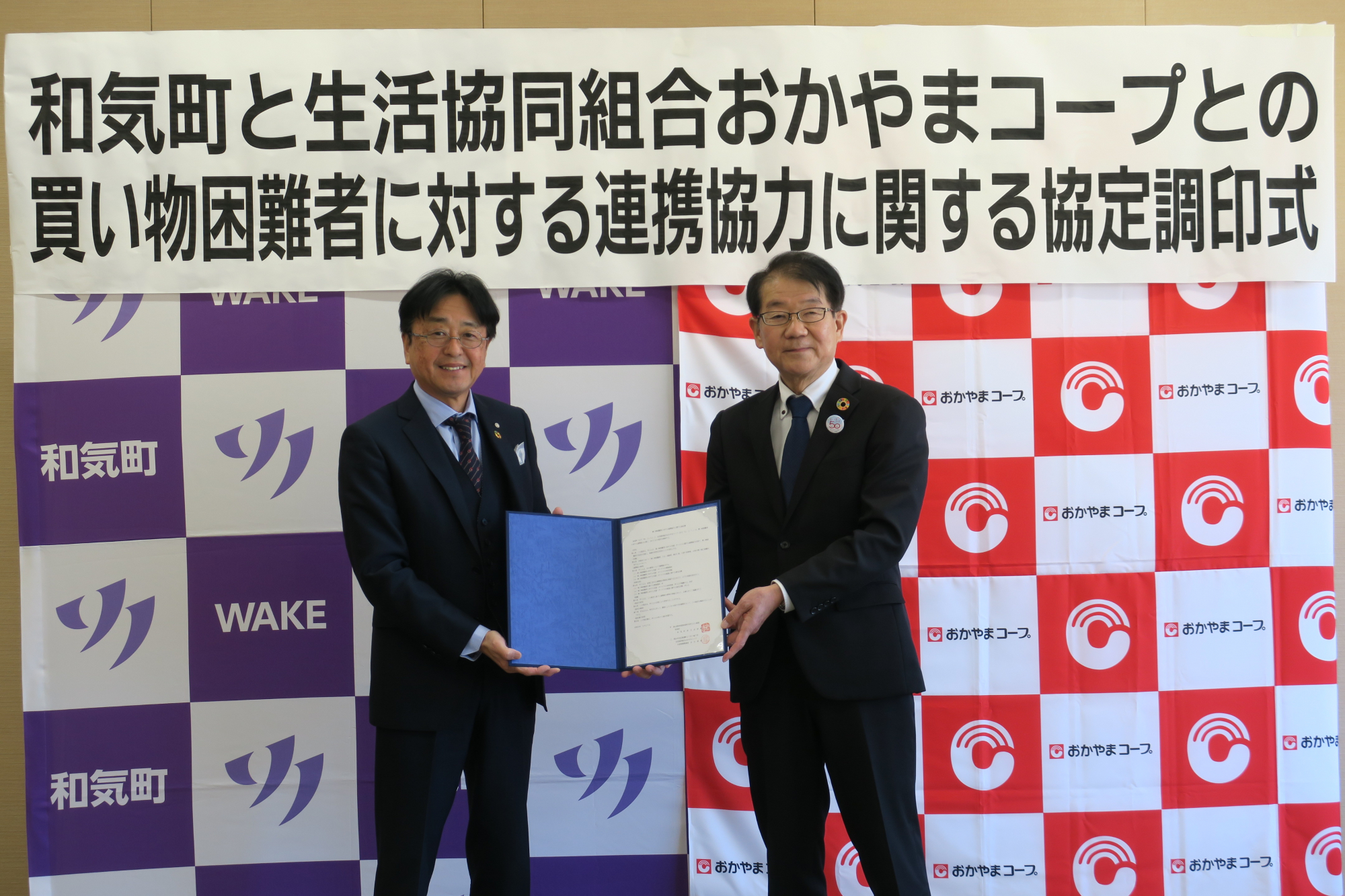 協定を締結した和気町 太田町長(左)とおかやまコープ 田中理事長