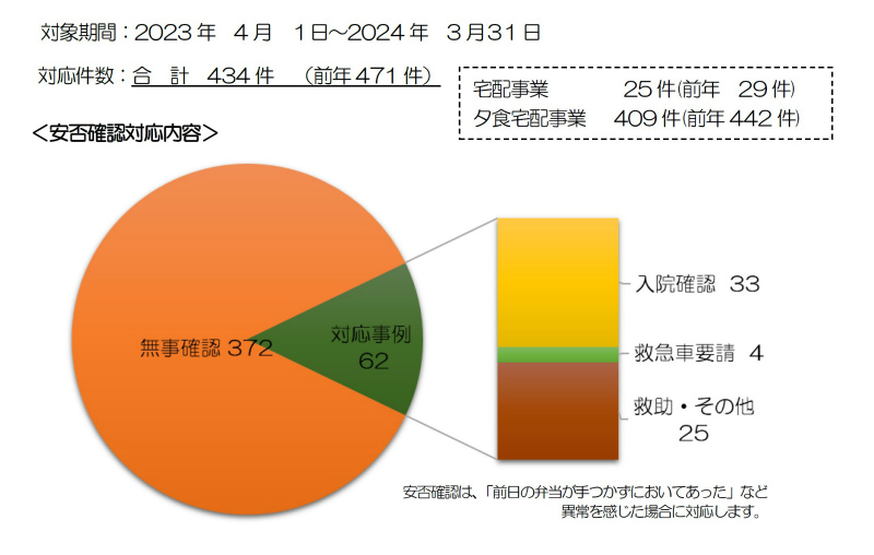 安否確認は、「前日の弁当が手つかずに置いてあった」など異常を感じた場合に対応しており、各自治体の地域包括支援センターへ情報連携しています。