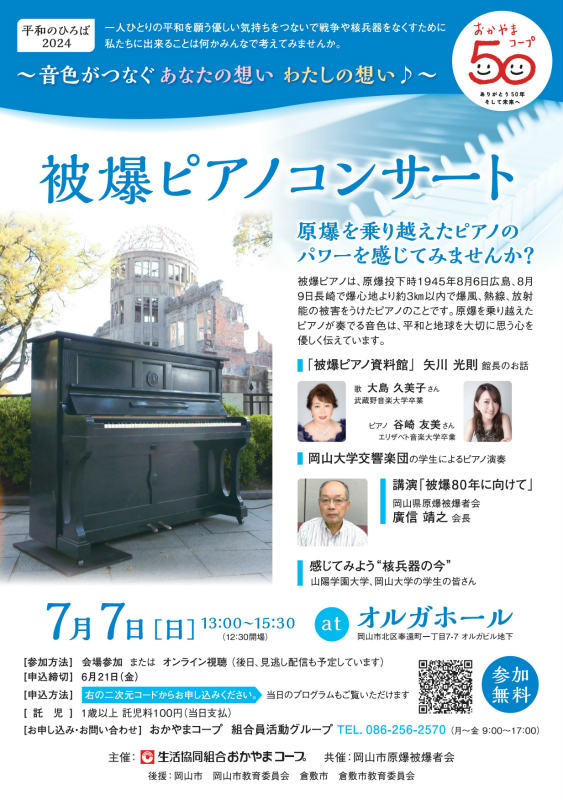 HOME 最新情報・お知らせ 平和のひろば2024を開催します 最新情報・お知らせ 平和のひろば2024を開催します 2024/05/02 おかやまコープは、核兵器のない世界の実現を願い、平和のさまざまな取り組みを行ってきました。世代を超え、国境を越え、平和の願いをつなげるため7月7日(日)、「平和のひろば2024」を開催します。 「平和のひろば2024」は、岡山県原爆被爆者会 会長の廣信 靖之さんの講演や「被爆ピアノ」コンサートを行います。 平和の大切さを感じてみませんか? そして、核兵器をなくすために、私たちにできることを考えてみましょう。 皆さんのご参加、お待ちしています。 プログラム(予定) ■「被爆ピアノ資料館」館長 矢川 光則さんのお話 ■「被爆ピアノ」コンサート ■講演「被爆80年に向けて」 岡山県原爆被爆者会 会長 廣信 靖之さん ■感じてみよう’‘核兵器の今’’ 山陽学園大学、岡山大学の学生の皆さん 申し込みはこちら お知らせ一覧に戻る