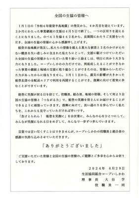 5月1日、コープいしかわより支援のお礼として感謝状をいただきました。