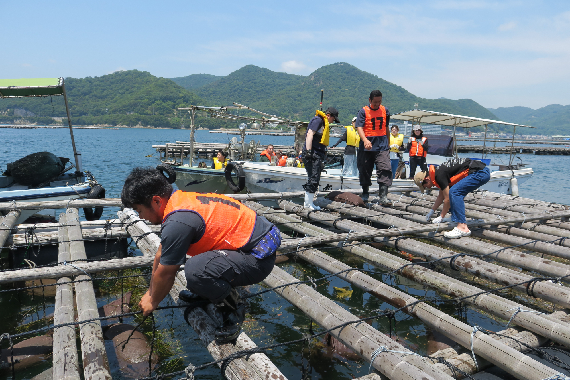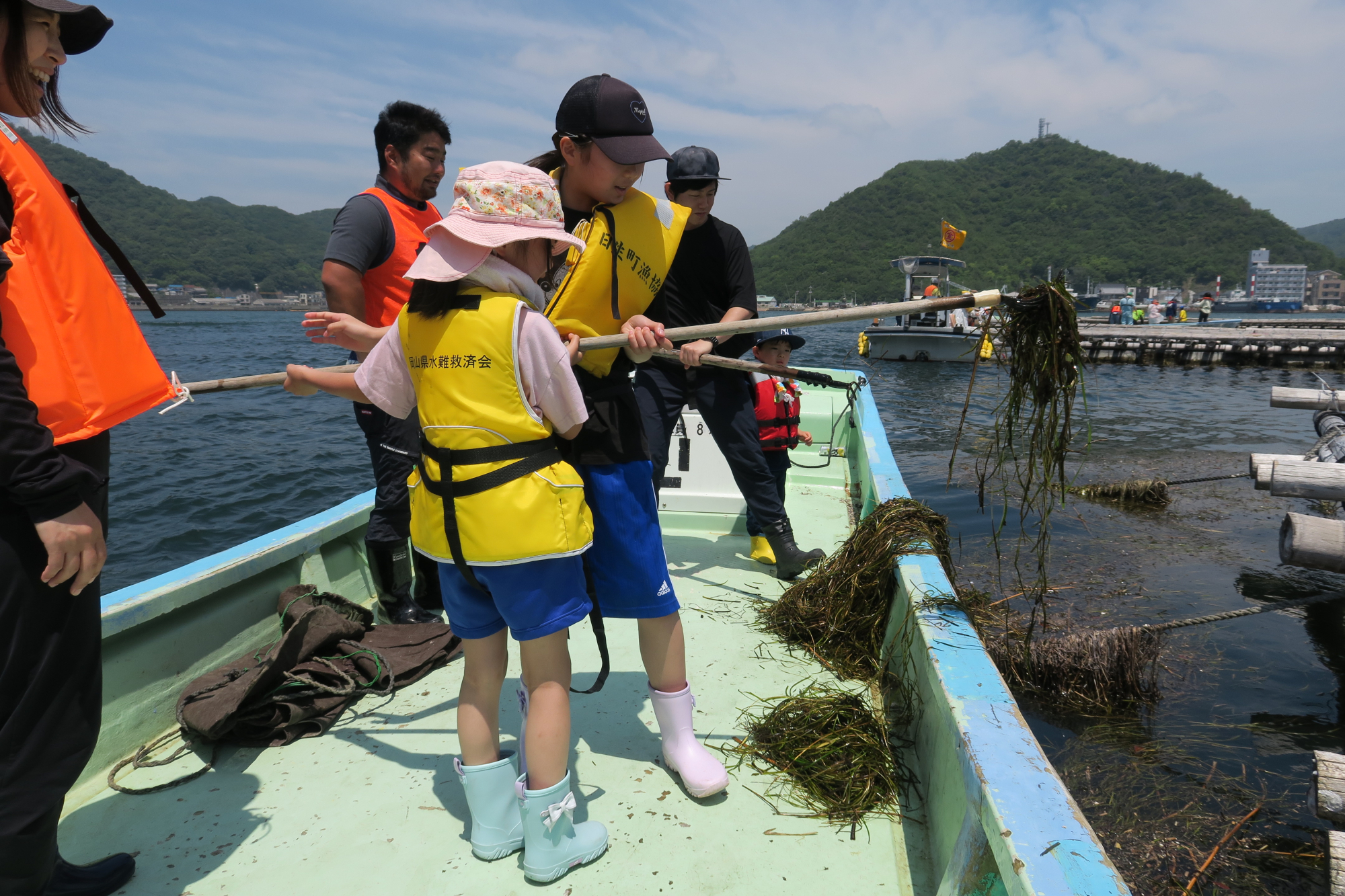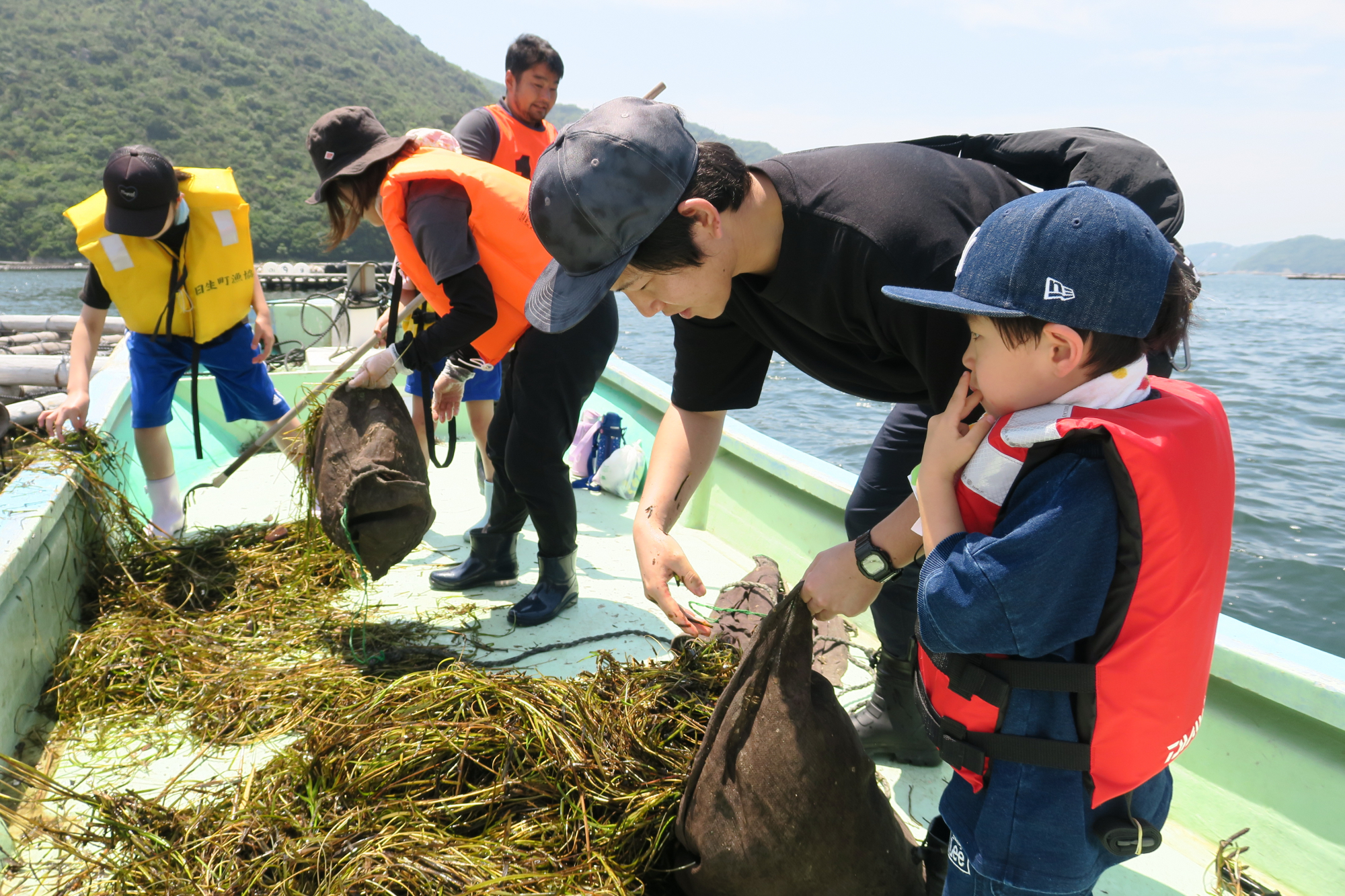 公益財団法人おかやま環境ネットワーク主催で開催され、おかやまコープ組合員含む約150名が参加。当日は天候にも恵まれ、カキ筏(いかだ)に絡まるように浮いている大量の“流れ藻”を鉤のついた棒で船に引き上げ、用意した保管用の網袋があっという間にいっぱいになりました。