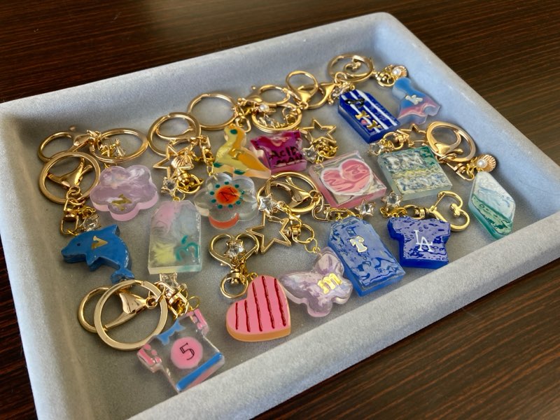 続いてレジンキーホルダー作り。いろいろな型に好きな模様を描き、世界にひとつのキーホルダーができあがりました。