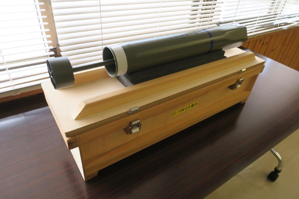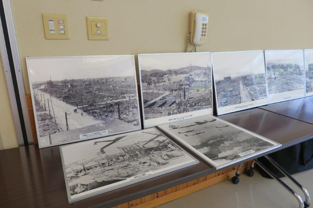 会場には、岡山空襲展示室からお借りした焼夷弾のレプリカや被災状況を撮影した写真パネルが展示されていました。