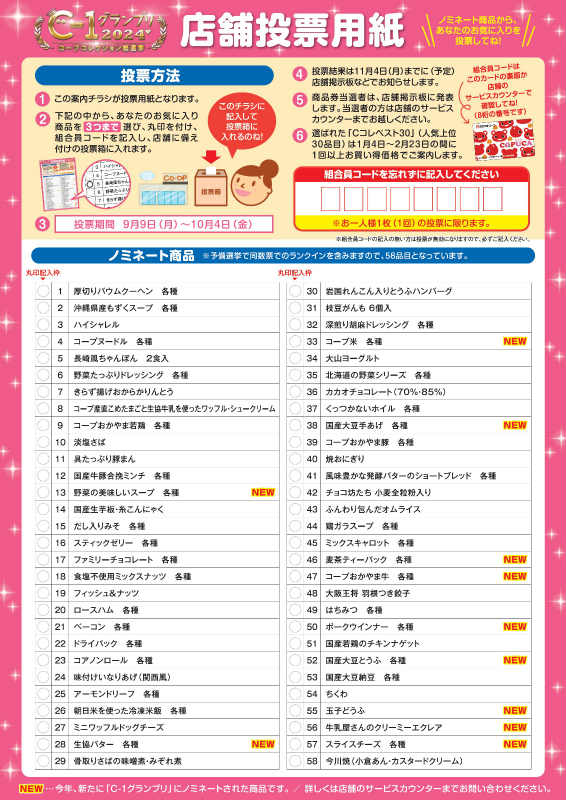 ふだんのくらしに欠かせない「コープならでは」の商品、コープコレクション商品=Cコレ。宅配部門・店舗部門それぞれのCコレ商品の中からあなたの1票で人気NO.1商品を決める総選挙です!ぜひ“いち押し”商品にご投票ください。