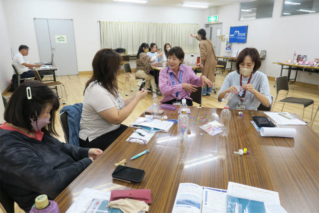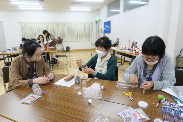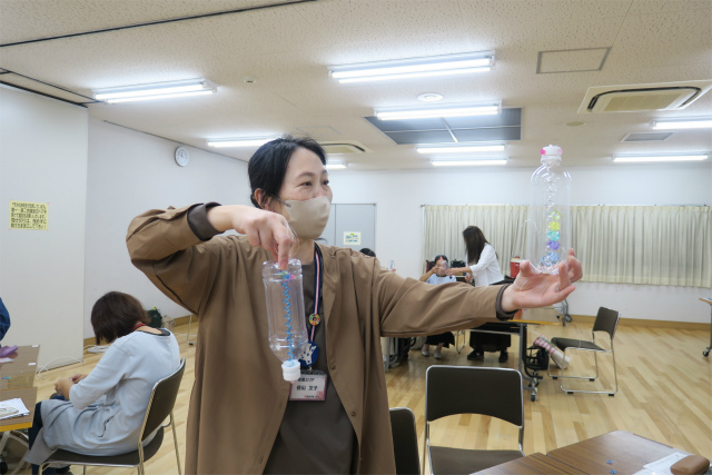 続いて、ネパールの赤ちゃんに贈るおもちゃを作りました。ペットボトルの中でカラフルなリングが回る、楽しいおもちゃです。竹久さんのお話を聞きながら、ネパールの赤ちゃんの笑顔を思い浮かべて手を動かしました。