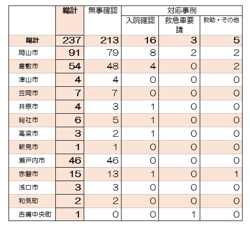 配達に伺ったところ、昨日お届けのお弁当が手付かずで、昨日・本日とも配達時のお声がけに対するお返事はありませんでした。部屋の電気は昨日、本日とも消えていました。ご本人と別居のご家族に連絡したところ、ご本人とお話ができました。横になっていたとのことで無事を確認できました。【表】 市町村別 安否確認対応件数(2024年4月1日~9月30日)