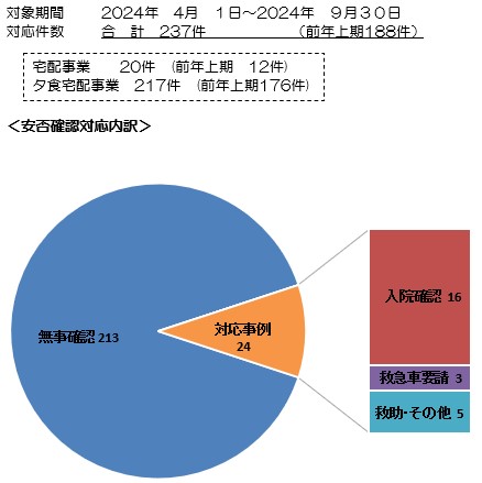 2024年度の上期は237件の安否確認対応を行い、213件の無事確認と24件の救急車要請等の対応を行いました。安否確認は、「先週のお届け商品がそのままになっていた」「前日の弁当が手つかずのまま置いてあった」「声を掛けても出てこられない」など異常を感じた場合に対応しています。