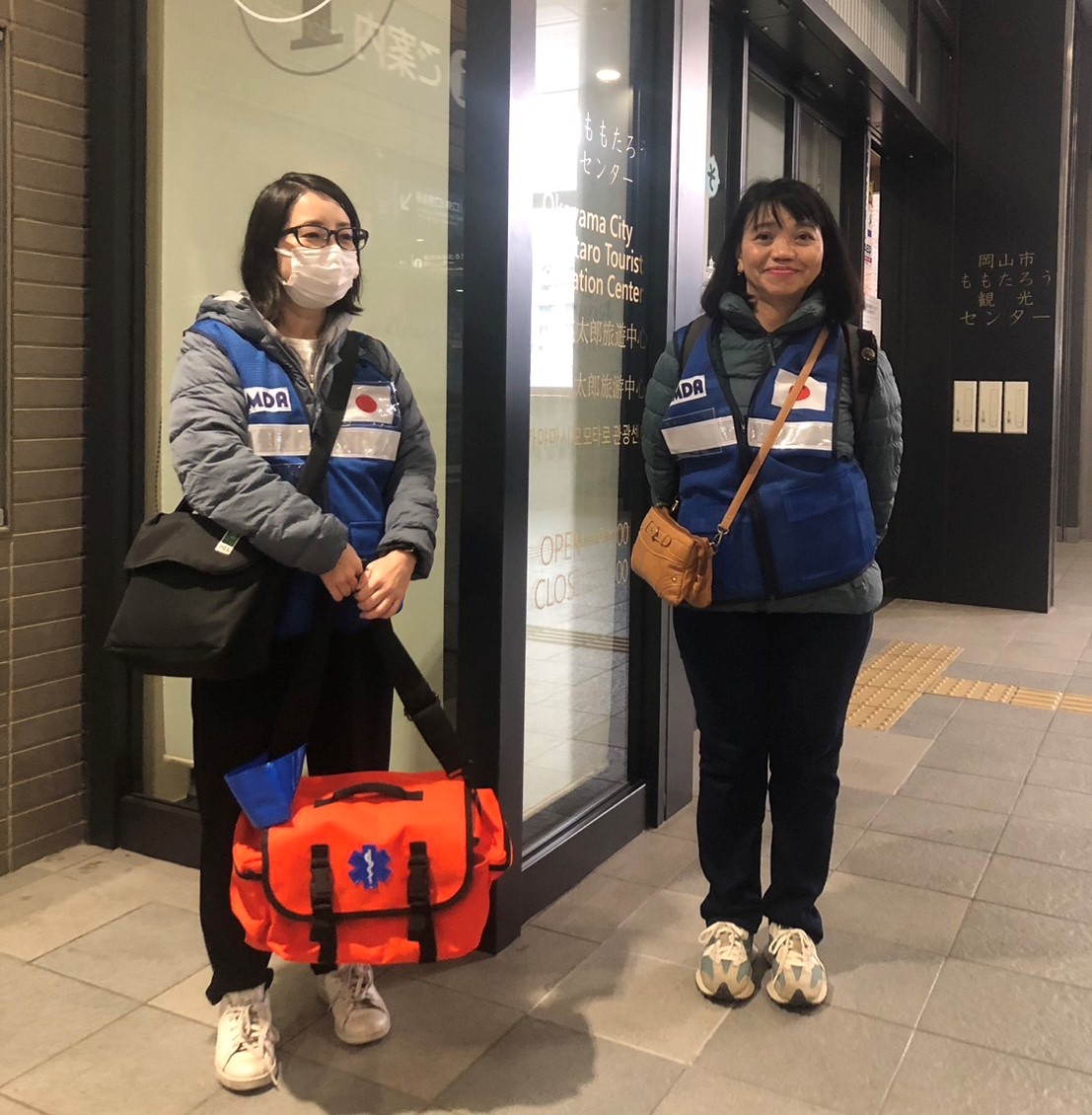 岡山駅から出発するAMDA調整員 西さん(右)、看護師 小川さん