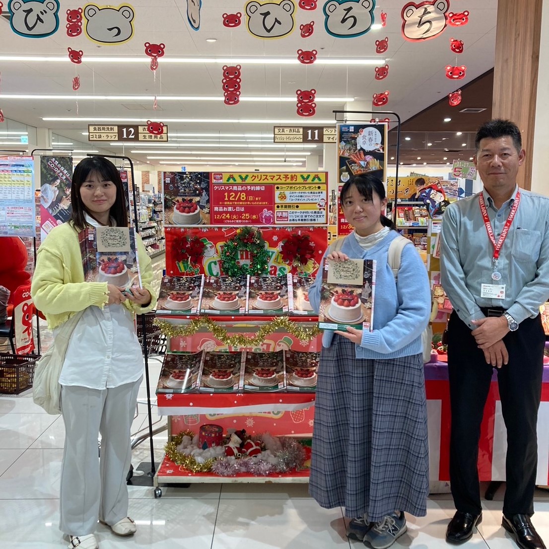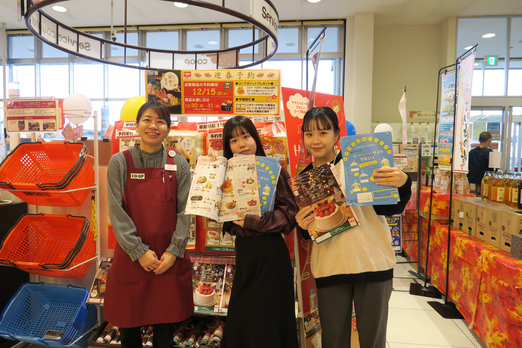 11月5日には、ノートルダム清心女子大学の学生の皆さんが、コープ大野辻でカタログ配布を行い、「切ってもクリスマスツリーに見える形にこだわりました。たくさんの家族に食べてもらいたいです」と話してくれました。