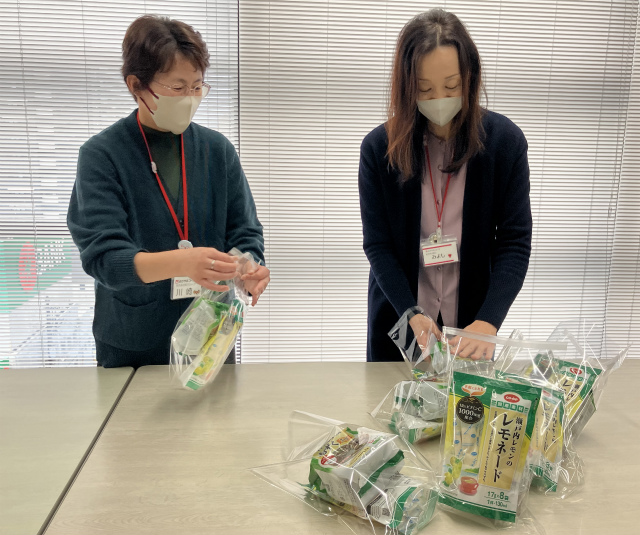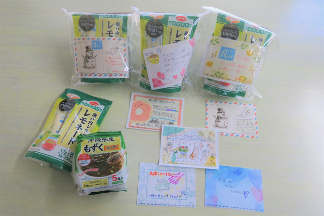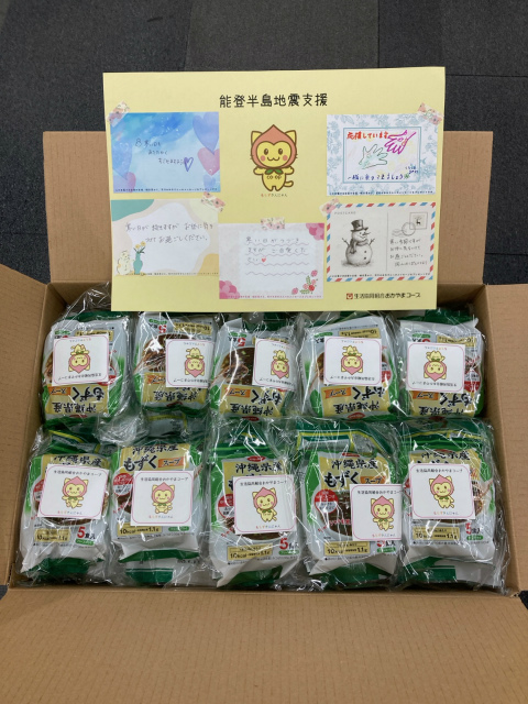おかやまコープは今回の募金を活用し、「沖縄県産もずくスープ」と「瀬戸内レモンのレモネード」100セットを組合員から寄せられたメッセージカードとともにコープいしかわへ贈りました。