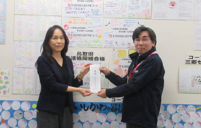 11月25日、おかやまコープ市川 洋子有識者理事がコープいしかわを訪問し、コープいしかわ大谷 学理事長にプレゼントする商品の目録をお渡ししました。