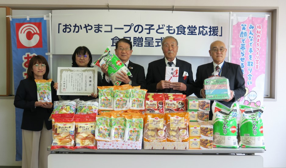 おかやまコープは、物価高騰が継続する経済状況の中で、厳しい運営を強いられながらも、「子ども食堂」や居場所づくりなどの活動に取り組むグループを応援しています。社会福祉協議会(以下 社協)やNPO法人を通じて、「子ども食堂」などへ県産こしひかりやキャノーラ油などのコープ商品を贈呈する取り組みを行っています。12月6日、赤磐市社協への贈呈式が同社協(赤磐市河本)で行われ、おかやまコープから田中照周理事長と組合員理事2名が参加しました。