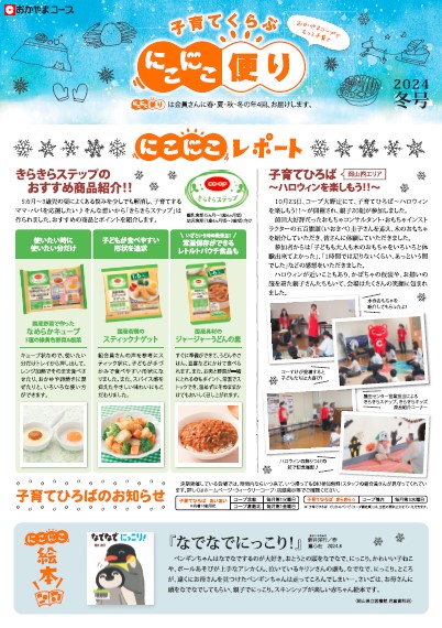 HOME 最新情報・お知らせ 「にこにこ便り」2024冬号を発行しました 最新情報・お知らせ 「にこにこ便り」2024冬号を発行しました 2024/12/16 子育てくらぶ「にこにこ便り」2024冬号を発行しました。 今回の「にこにこレポート」は、「きらきらステップのおすすめ商品紹介!!」と「子育てひろば~ハロウィンを楽しもう!!~」(岡山西エリア)を紹介しています。 コープのお店のラック等にも置いてありますので、ぜひご覧ください。 ↓こちらをクリック↓ お知らせ一覧に戻る