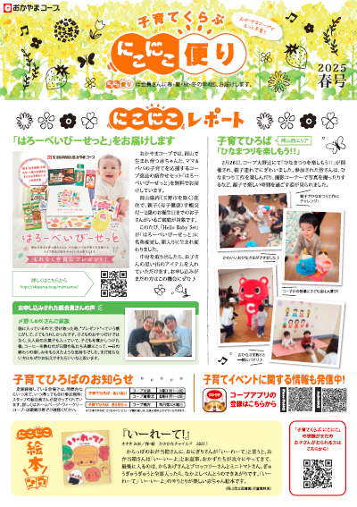 HOME 最新情報・お知らせ 「にこにこ便り」2025春号を発行しました 最新情報・お知らせ 「にこにこ便り」2025春号を発行しました 2025/04/27 子育てくらぶ「にこにこ便り」2025春号を発行しました。 今回の「にこにこレポート」は、「はろーべいびーせっとをお届けします」と「子育てひろば~ひなまつりを楽しもう!!~」(岡山西エリア)を紹介しています。 コープのお店のラック等にも置いてありますので、ぜひご覧ください。 ↓こちらをクリック↓ お知らせ一覧に戻る
