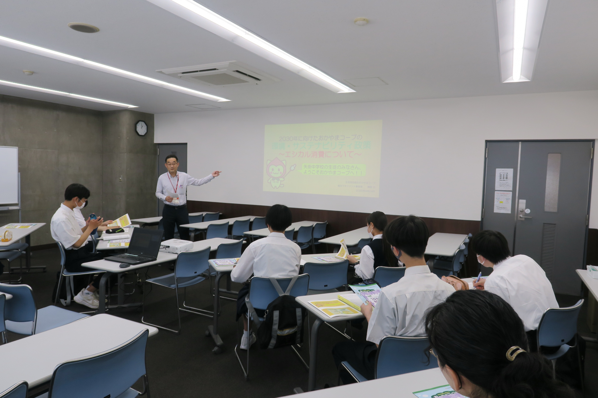 樽岡さんは、「エシカル消費」の4つの視点について、おかやまコープが取り組んでいる具体的な事例をそれぞれ紹介。昨年「再建50周年」を記念して地元の大学生や高校生とコラボして開発した商品についても話し、質疑応答の時間も設けました。