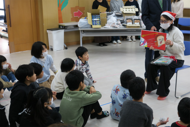 この日は「ふれあいクリスマス会」が開かれ、おかやまコープ虹の会 秋山秀行会長が扮する「だがしおじさん」のパフォーマンス、おかやまコープ岡山西エリア組合員さんによる「フラフープ玉入れゲーム」、絵本の読み聞かせなどが行われました。子どもたちからは、可愛いダンスの披露もあり、子ども達の笑顔がひろがるにぎやかなクリスマス会となりました。