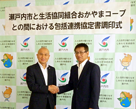 瀬戸内市役所で行われた調印式では、おかやまコープの平田昌三理事長と武久顕也市長が協定書にサインし、固い握手を交わしました。
