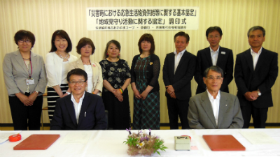 5月27日、おかやまコープは奈義町と「地域見守り活動に関する協定(奈義町社会福祉協議会との三者)」「災害時における応急生活物資等に関する基本協定」を締結し、今後三者で連携・協力に努め、町民サービスの向上や地域活性化に活かしていくこととしました。
