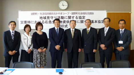 おかやまコープから地域の安全安心を確保するために、地域見守り協定、災害時物資協定の提案を受け、締結することができました。少子化・高齢化の進行や認知症の方の増加などが課題となっており、町だけでは無理な状況。町民の安全安心を確保するために、これから3者で連携して課題解決を進めていきたい。