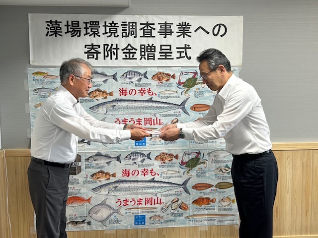 5月28日(水)、岡山県庁にて行われた贈呈式には、おかやまコープ田中照周理事長、村上利知己(りちみ)全体理事、川福めぐみエリア理事、岡山県からは、清水浩史農林水産部長、鳥井正也農林水産総合センター水産研究所長、石飛博敏農林水産部水産課長らが出席しました。
