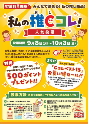 宅配部門・店舗部門それぞれのCコレ商品の中からあなたの1票で人気No.1商品を決める投票です!ぜひ、“いち押し”商品にご投票ください。