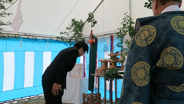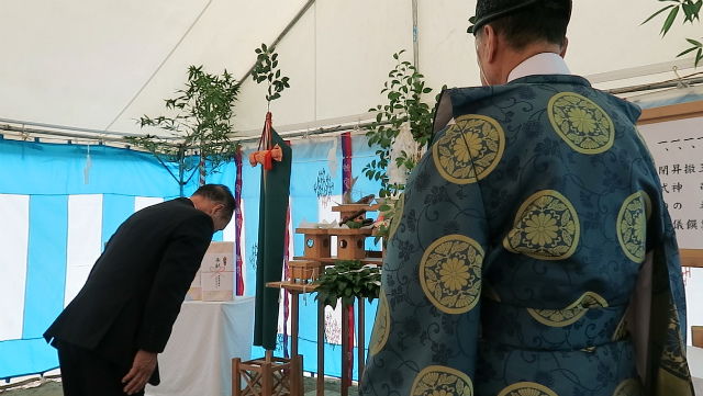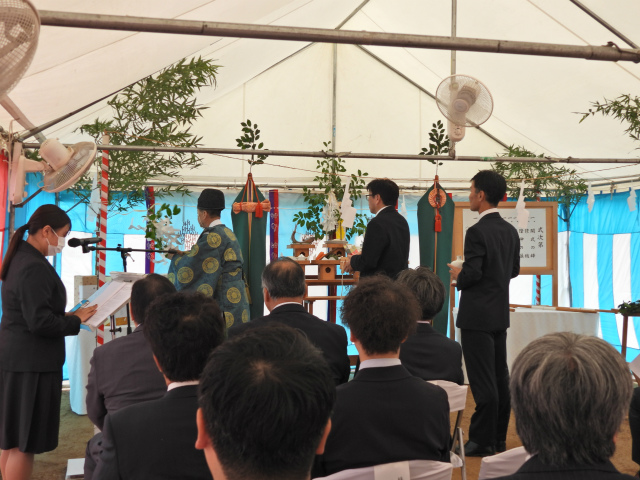 神事ではまず、工事の安全を祈る「清祓(きよはらい)」が行われ、続いて神様をお迎えする「降神」と祝詞奏上で、工事の安全と地域の皆さまへの感謝の思いが捧げられました。