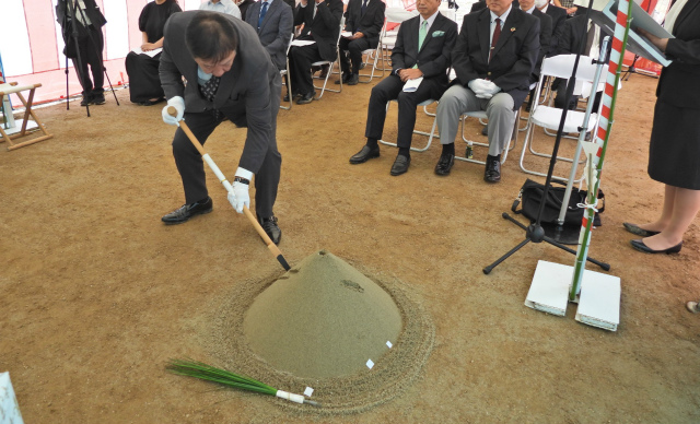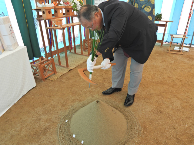 「鍬入の儀」での鋤入れ(矢野建設産業株式会社 代表取締役社長 矢野利明様)