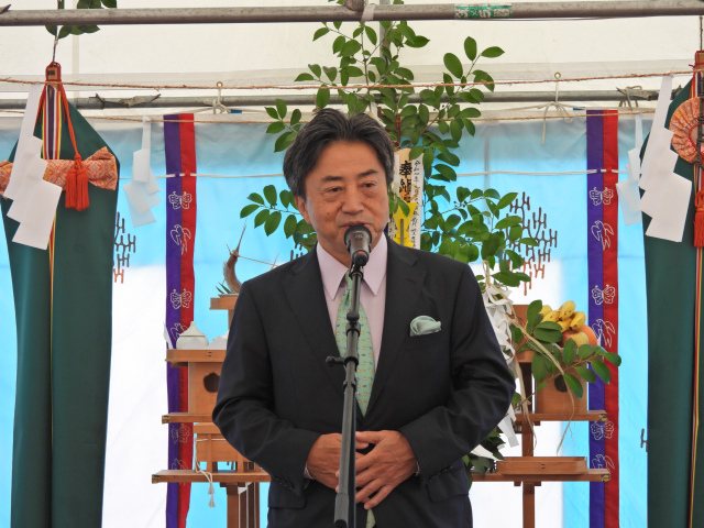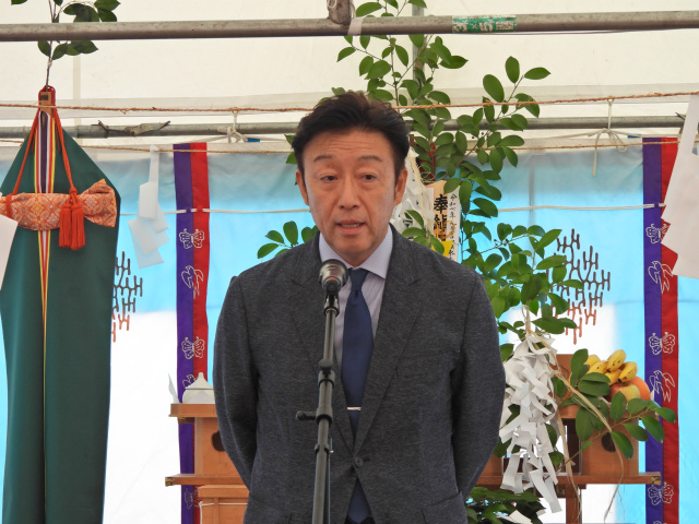 「総社市長 片岡聡一様をはじめ、地権者の皆さま、テナント各社の皆さま、矢野建設産業株式会社の皆さま、株式会社山陽設計の皆さま、本日は誠にありがとうございます。総社市では約3万世帯のうち1万5千世帯を超える方にご加入いただき、店舗や宅配を幅広くご利用いただいています。火災がきっかけとはなりましたが、新しく生まれ変わるコープ総社東が、より一層地域の皆さまに親しまれ、くらしを豊かにする拠点となるよう取り組んでまいります。」