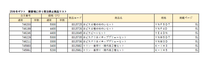 また、2025冬ギフトにつきましては下記のアサヒグループ関連商品の受注を停止しております。