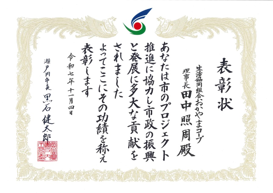 11月4日(火)、瀬戸内市役所で表彰式が開催され、瀬戸内市 黒石健太郎市長よりおかやまコープ 田中照周理事長へ表彰状が授与されました。