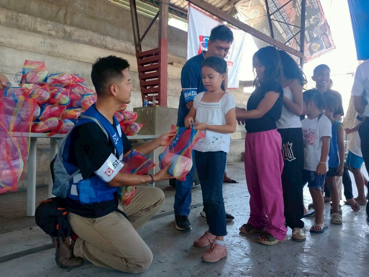 子どもたちに支援物資を渡すAMDAスタッフ(10月19日フィリピンセブ島にて:AMDA提供)