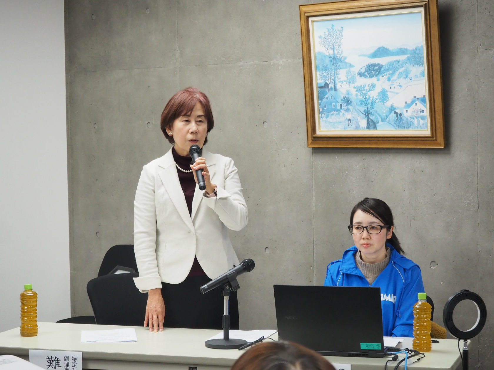 AMDA難波妙副理事長(左)と支援活動報告を行ったAMDA職員