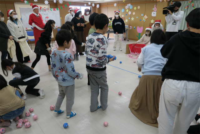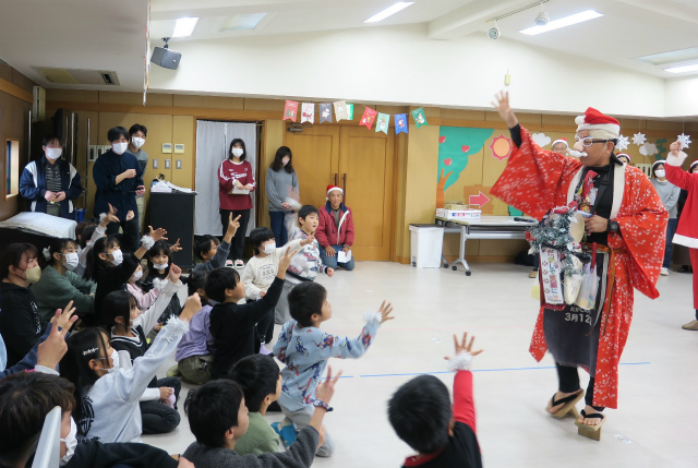 この日は「ふれあいクリスマス会」が開かれ、おかやまコープ虹の会 秋山秀行会長が扮する「だがしおじさん」のパフォーマンス、おかやまコープ岡山西エリア組合員さんによる「フラフープ玉入れゲーム」、絵本の読み聞かせなどが行われました。子どもたちからは、可愛いダンスの披露もあり、子ども達の笑顔がひろがるにぎやかなクリスマス会となりました。