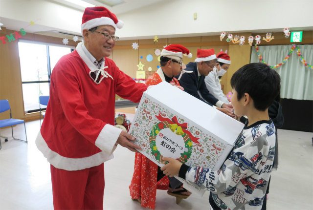 12月20日(土)、社会福祉法人 南野(なんや)育成園(岡山市北区)で食品と絵本の贈呈式が行われ、虹の会を代表して㈱大町 秋山秀行会長、JA全農おかやま 伍賀弘県本部長、オハヨー乳業㈱ 岡山営業所 上野正浩リーダーと、おかやまコープ 田中照周理事長、組合員の代表らが出席し、子どもたちに食品などを手渡しました。