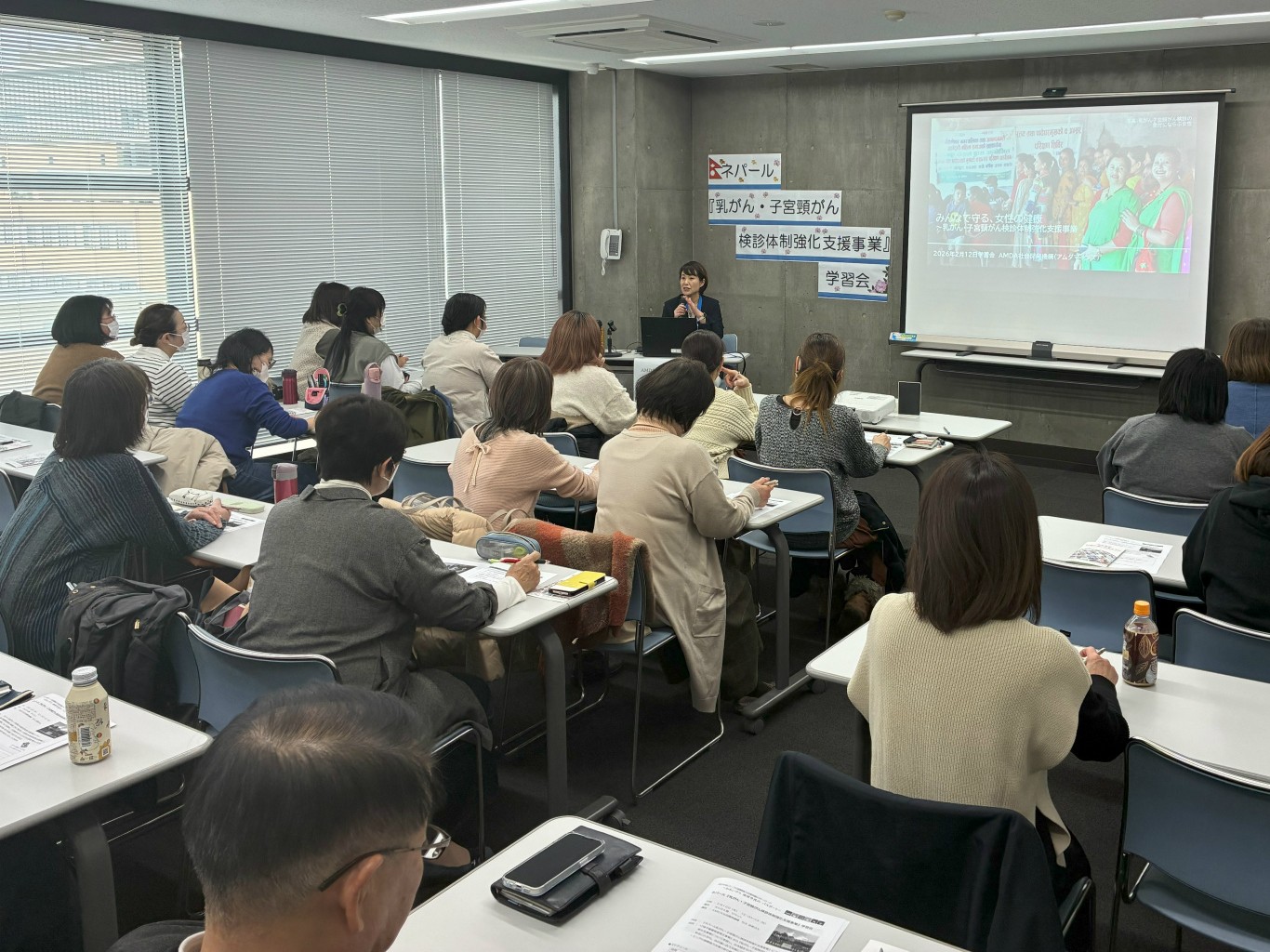 おかやまコープは、2026年度から、AMDA社会開発機構「乳がん・子宮頸がん検診体制強化支援事業」に対し、AMDA基金から支援金100万円を贈呈して活動を応援します。2月12日、AMDA社会開発機構の竹久佳恵さんを講師にお迎えし、2026年3月からネパールで始まる新たな事業「乳がん・子宮頸がん検診体制強化支援事業」の学習会を開催し、理事・組合員・職員36名が参加しました。