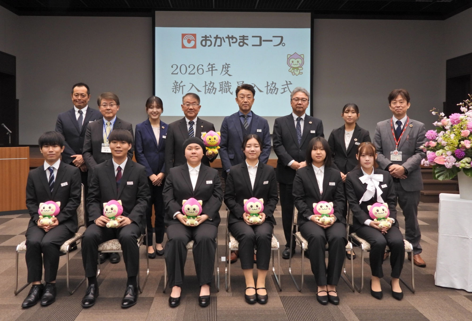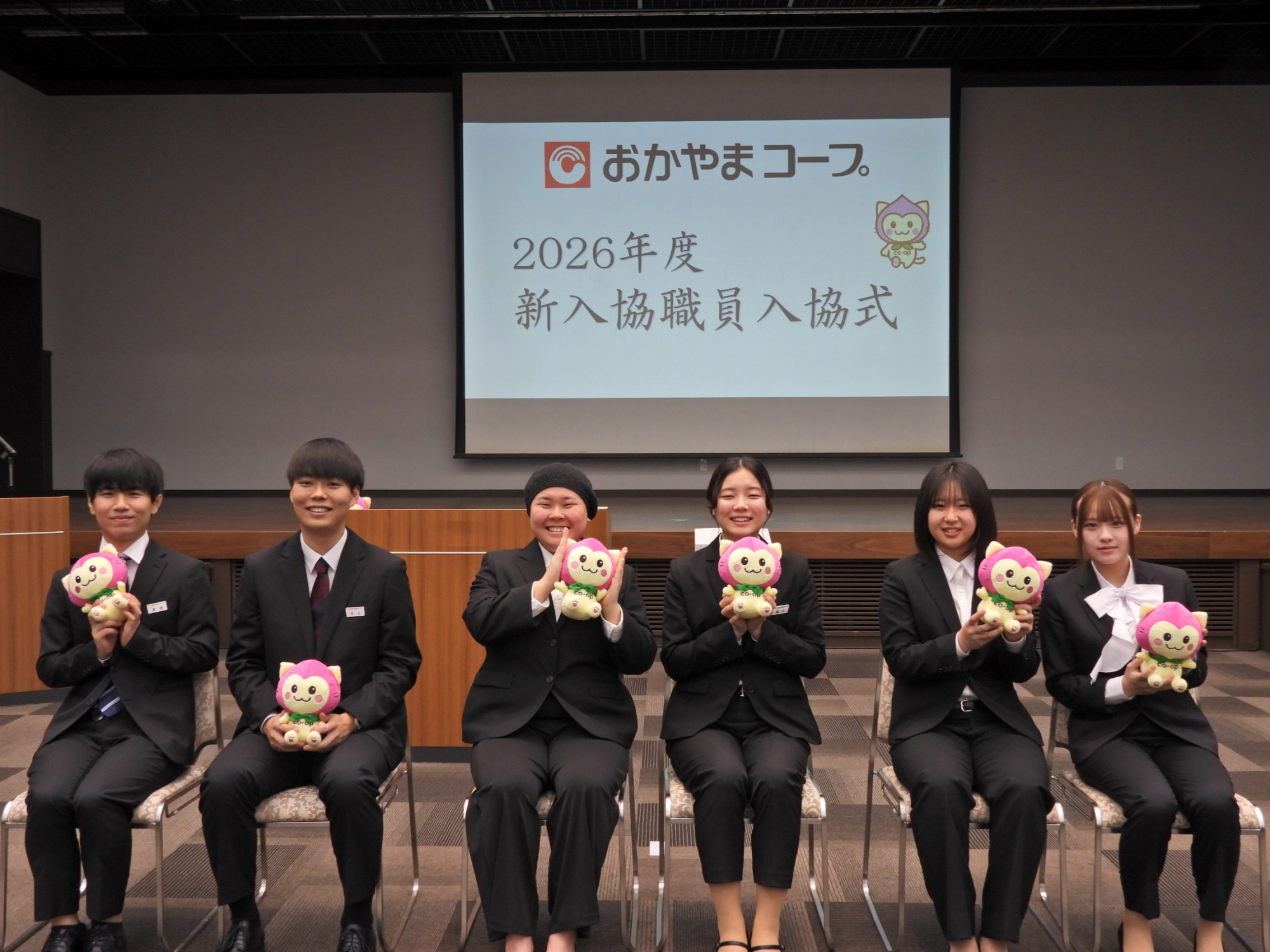 新入協職員6名。手にしているのはおかやまコープ公式キャラクター「ももずきんにゃん」ぬいぐるみ