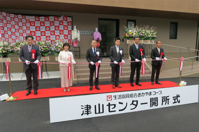 開所式では、株式会社ベン建築設計 代表取締役 大月始様、梶岡建設株式会社 代表取締役 梶岡秀成様、下横野町内会 副会長 末長眞様、おかやまコープ田中照周理事長、徳山雅昭専務理事、生内清恵美作エリア理事によるテープカットが行われました。