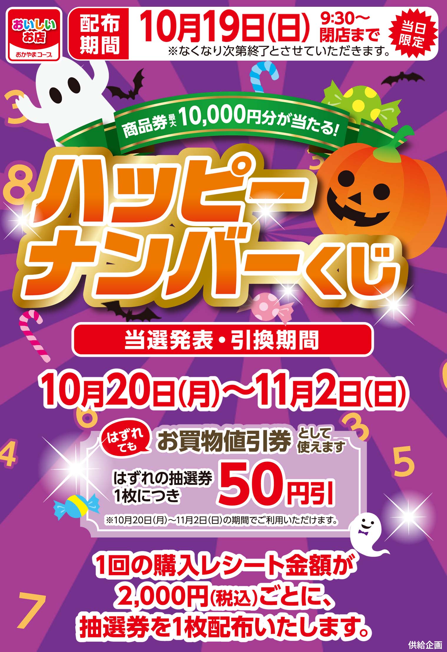 10月19日(日)9時30分~閉店まで「ハッピーナンバーくじ」を全店(※コープ総社東は休業しております)で配布します。