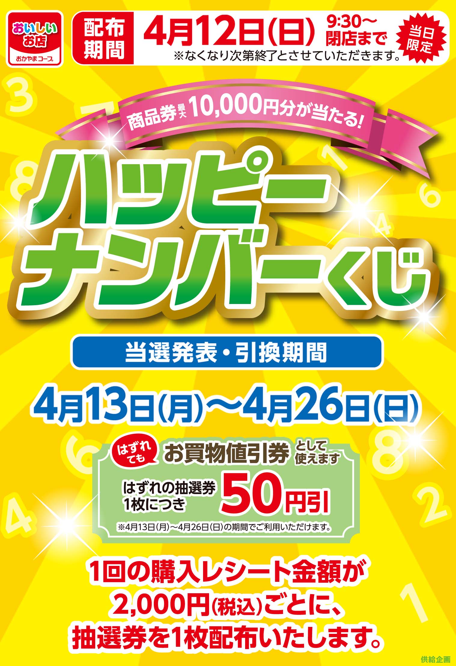 4月12日(日)9時30分~閉店まで「ハッピーナンバーくじ」を全店(※コープ総社東は休業しております)で配布します。